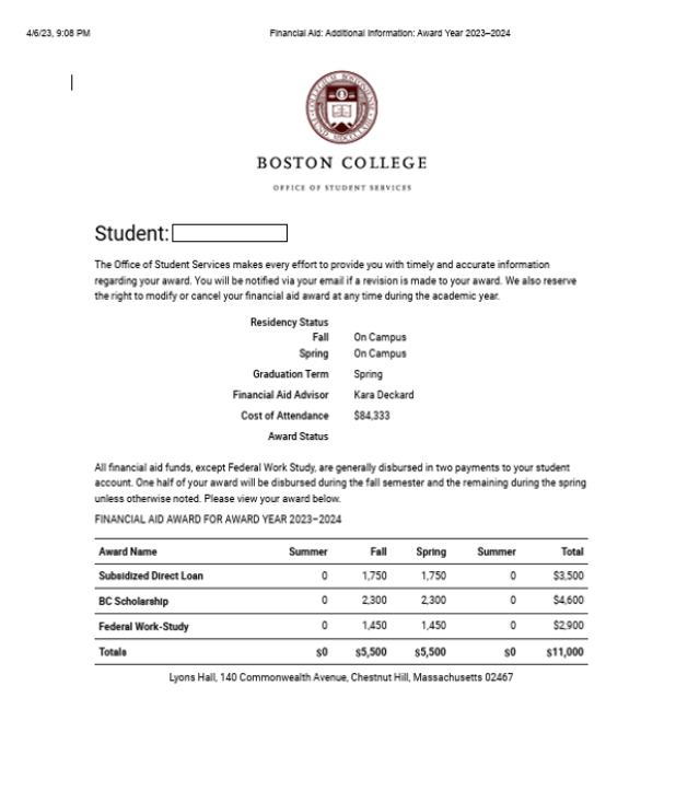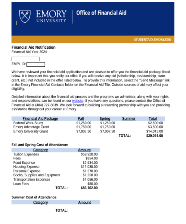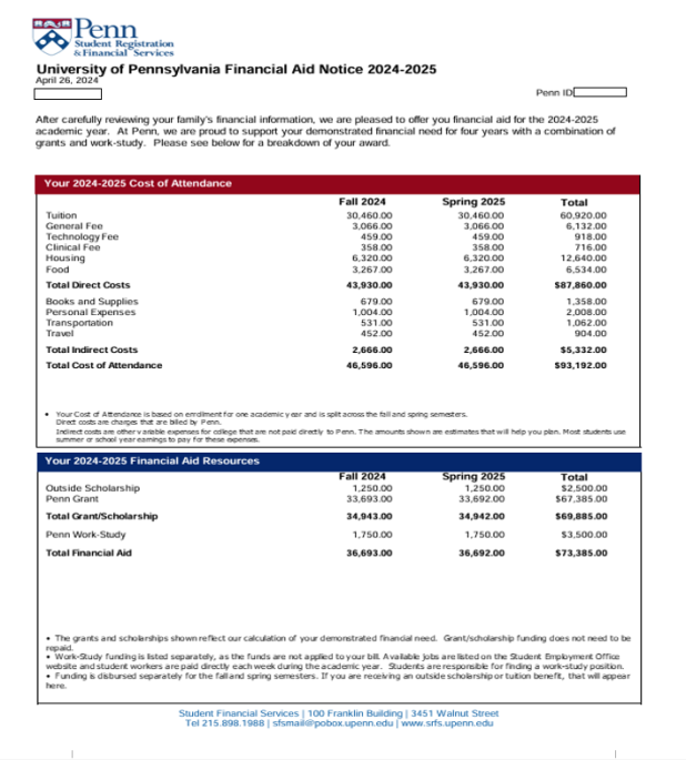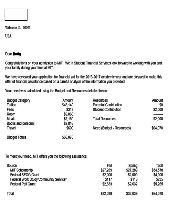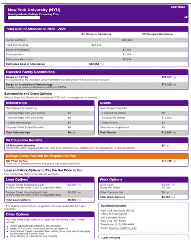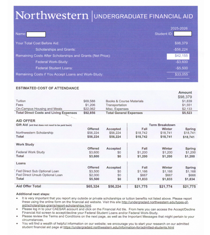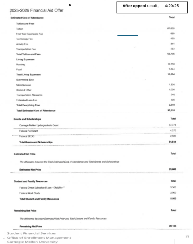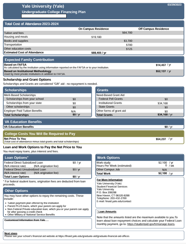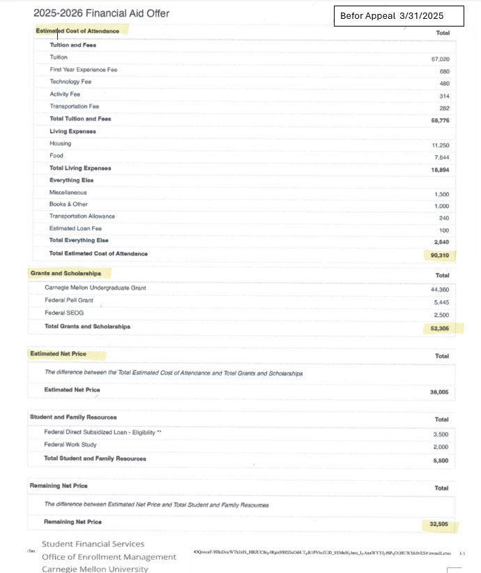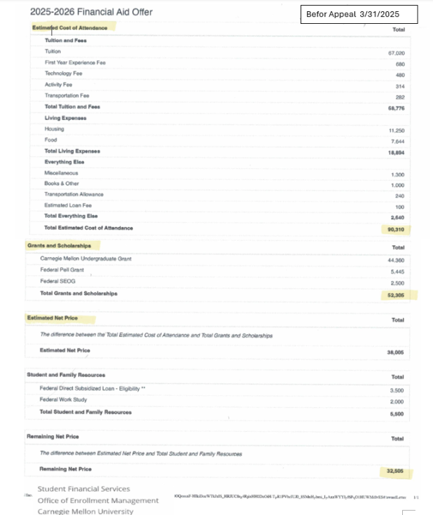 During the initial financial aid offer, the student was expected to contribute $32,505 per year out-of-pocket—an amount that posed a serious financial concern for the family.