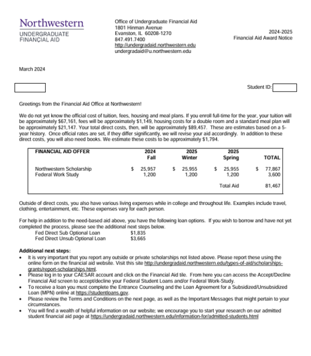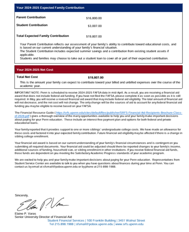 As a result, the family received an additional $31,444 in non-loan financial aid, significantly reducing the tuition burden compared to the original offer and even lower than freshman year.