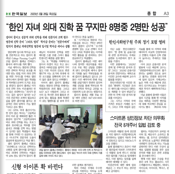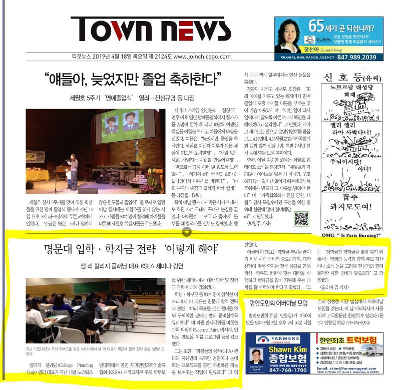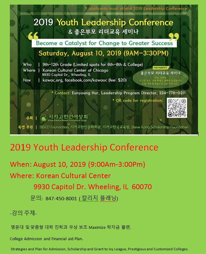 8월10일 칼리지 플래닝 샘리 대표가 여성회가 주최하는 청소년 리더쉽 컨퍼런스에 강사로 초청 받아 강연을 한다. 강연주제는 명문대 합격과 맞춤형 대학 진로 상담과 무상보조 Maximize 학자금 플랜이다.