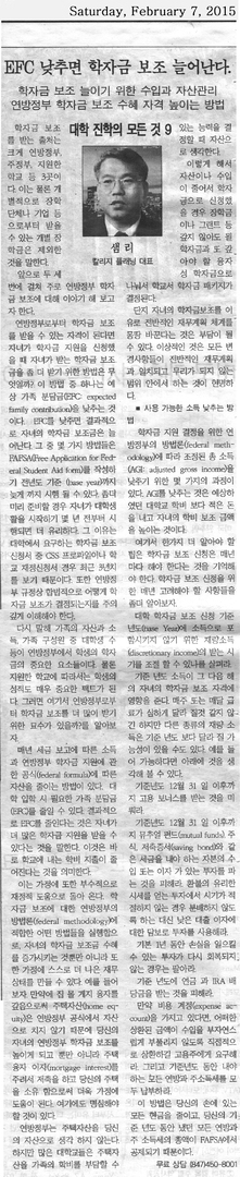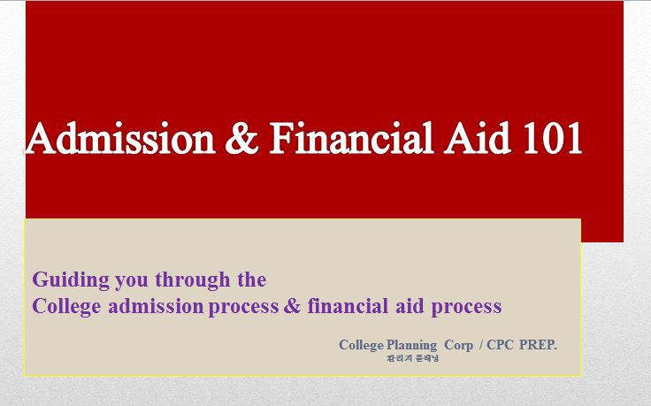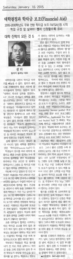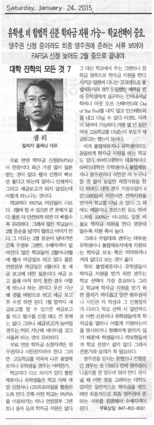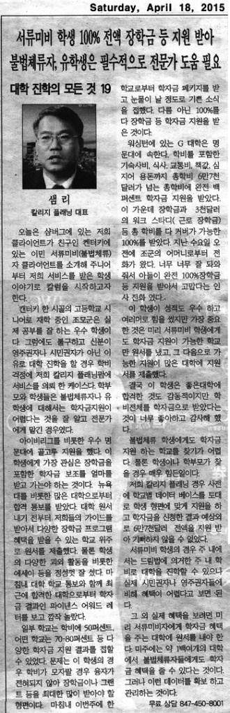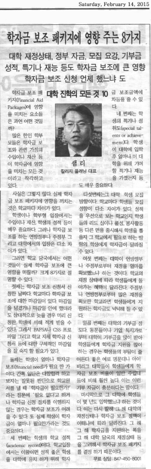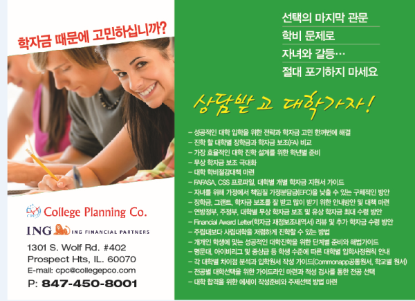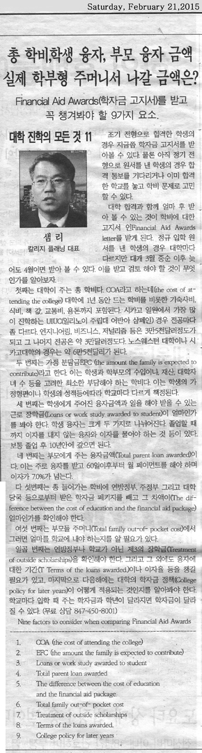 AID)라는 부분의 가족 형편에 맞는 도움을 받는다. 부모님과 학생들은 학비고지서를 받고도 뭐가 어떻게 이런 계산이 나왔는지 또는 무상 보조를 더 이상 받을 수는 없었는지, 정부나 학교에서 주는 무상 보조 외에도 외부에서 받을 수 있는 장학금은 없었는지 등을 알 수가 없다.”며  그래서 많은 학부형들이 학비 통지서를 받고서 통지서를 가지고 칼리지 플래닝을 찾는 이유라고 덧붙였다. 물론 전문가는 통지서를 보면 바로 알 수 있고 어떤 근거로 이런 숫자가 나왔는지 분석하고 조치를 취한다”는 것이다.