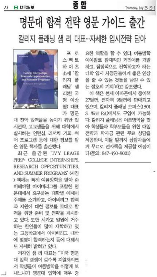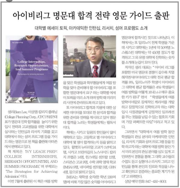 현재 명문대 입학신청 중인 이 학원 학생(Justin Lee. Stevenson High School senior)이 지난해 11월 그간 리서치를 모아 책으로 발간, 이를 아마존에서 팔고 있는 건 지역신문 ‘데일리헤럴드’에 소개되기도 했다. ‘대학입학도 전략과 플랜’이라는 이 학원 노하우 중 하나다.