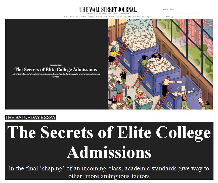 미국의 가장 유명한 신문중 하나인 월스트릿 저널이 소개한 미국 엘리트 대학들의 학생선발의 비밀에 대한 기사를 원문그대로 소개한다.