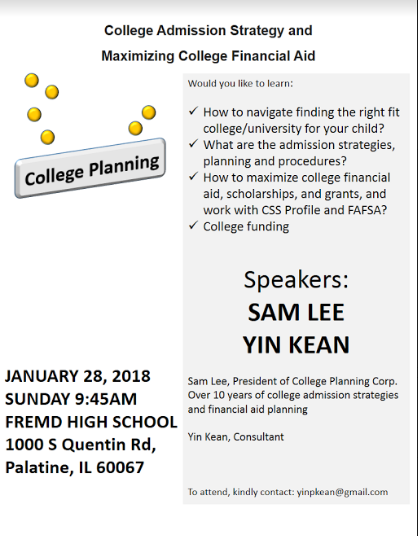 대학 입학 전략과 학자금 최고 혜택 방법라는 주제로 칼리지 플래닝 샘리 대표가 28일   팔레타인 소재 프램드 하이스쿨 (FREMD HIGH SCHOOL)에서 세미나를 개최 한다.