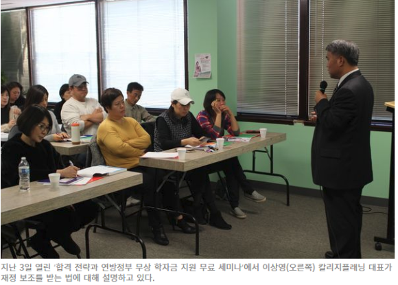 칼리지플래닝의 ‘합격 전략과 연방정부 무상 학자금 지원 무료 세미나’가 지난 3일 윌링에 있는 K라디오 공개홀에서 열렸다. 이상영 칼리지플래닝 대표는 이번 세미나에서 전문가들의 도움을 받아 합격 전략과 재정 보조를 받는 방법을 찾아야한다고 강조했다. 그는 “미국 대학은 불법체류자까지 재정을 지원해주는 시스템이 잘 준비돼 있다”며 “하지만 서류를 준비할 때